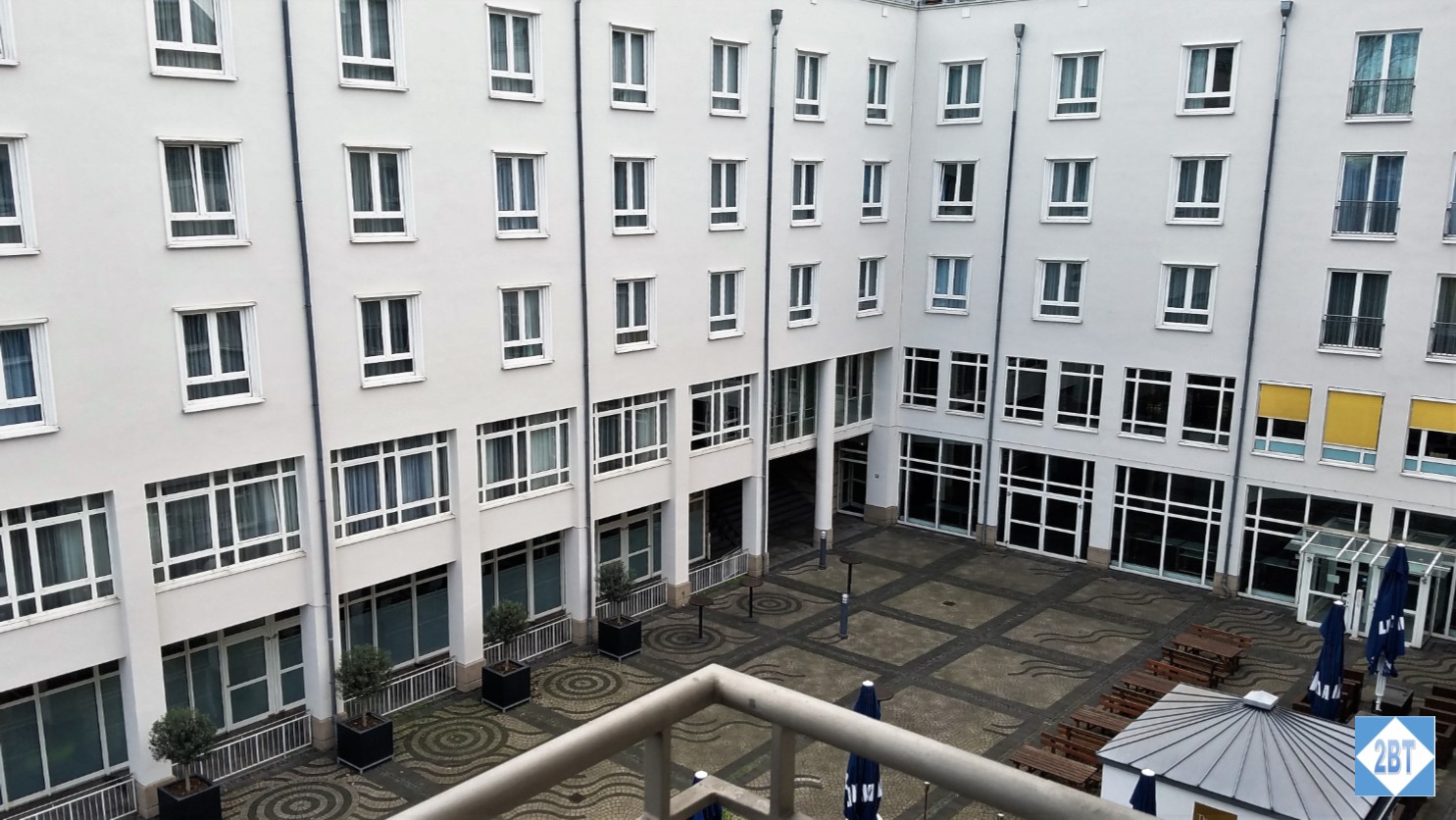 The hotel is in a U-shape with the entrance on the “bottom” of the U. The courtyard between the “arms” of the U faces the river. Here’s the view of the courtyard from the street between the hotel and the river.