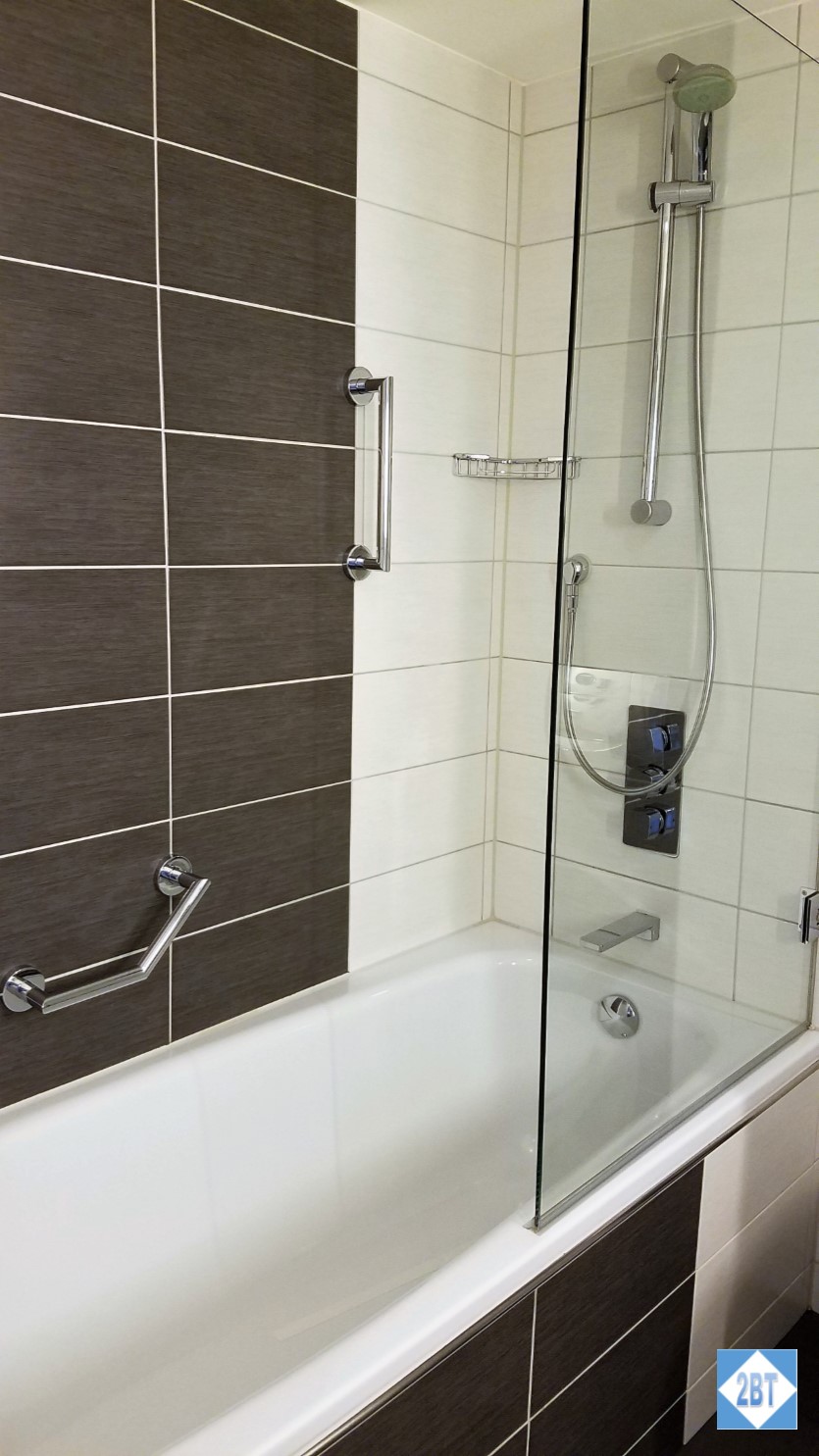 The bathroom was fairly standard with a shower/tub on one side (and that darn glass partition that’s only 1/3rd the length of the tub!), the toilet in the center and the sink on the other side of the room.