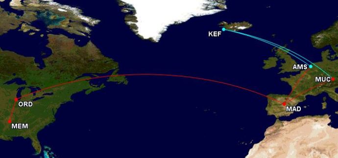 Our flight path. Lines in red represent flights on Iberia while the lines in blue were flights on Icelandair.