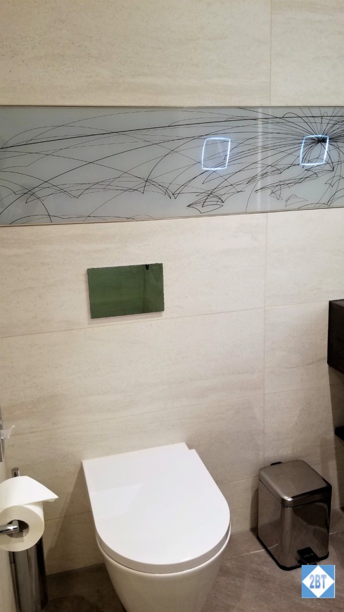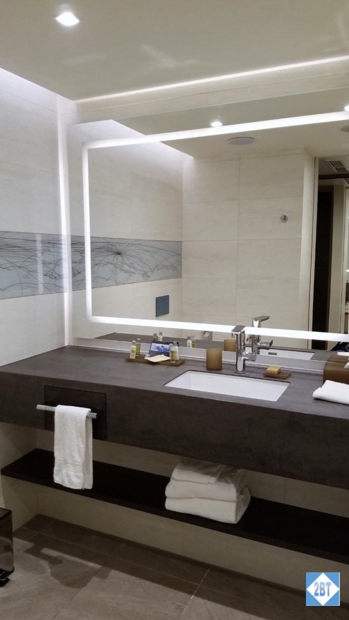 The bathroom was wider than it was long. Against the back wall was the sink in the middle of a long counter. There was plenty of room for our toiletry bags and I liked that there was also a shelf underneath for extra towels and extra storage, had we needed it.