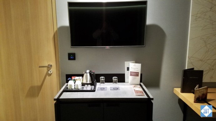 Next to that was a wall-mounted TV (that we didn’t turn on) and a cabinet. On top of the cabinet was a kettle and coffee & tea supplies along with a couple of drinking glasses. You can see from the photo that ours was a connecting room but we never heard a peep if there was anyone staying there.