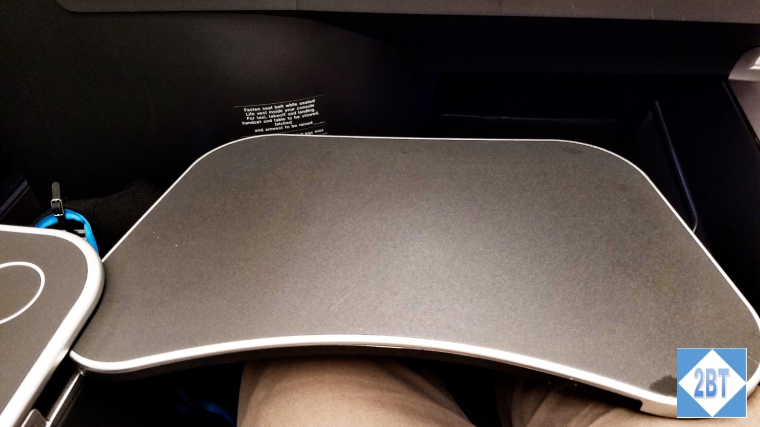 To my left was an upper shelf and a lower shelf. Up top the headphone hung on a hook and the rest of the shelf was open with a small “fence” to keep items from sliding off. At the end of the shelf was a clever compartment where the bottle of water could be stored. Only downside to this was that it couldn’t be reached while the seat was in bed mode but that wasn’t an issue for me.