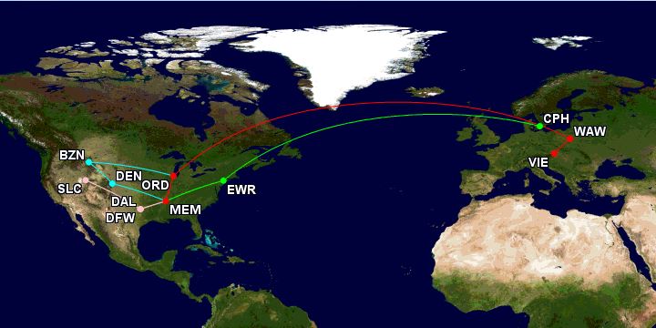 Cyan: Ski trip to Big Sky (Bozeman), Montana, Pink: Ski trip to Park City (Salt Lake City), Utah, Green: Business Trip to Copenhagen, Red: Business Trip to Vienna (49,830 miles)