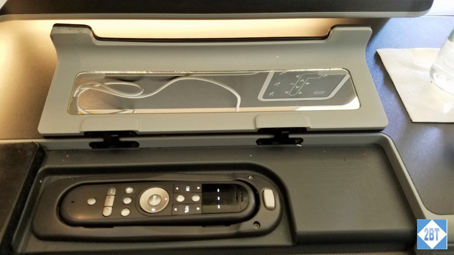 The IFE controller was tucked underneath the armrest. A mirror was on the underside of the cover, making it easy to tilt it toward your face.