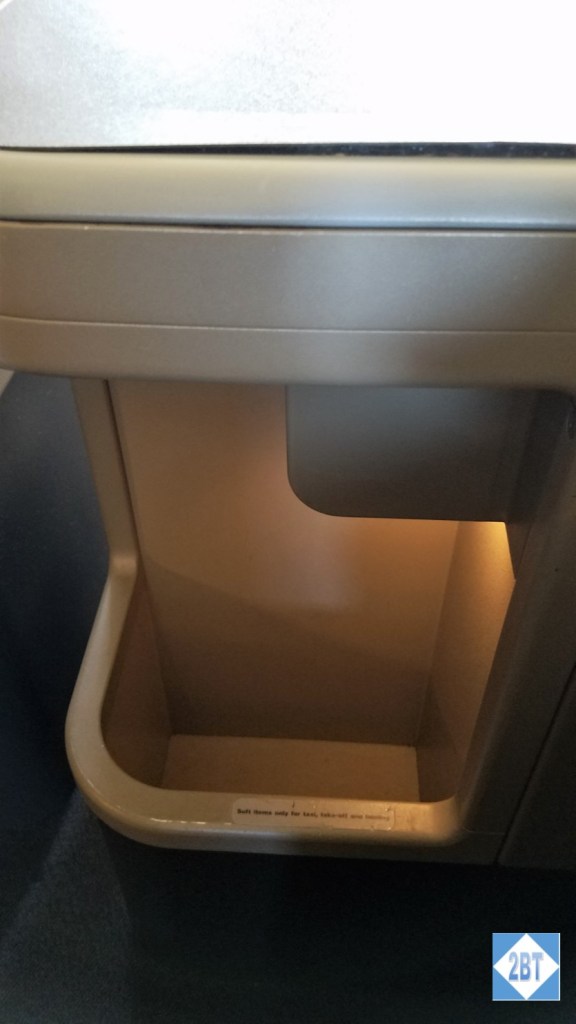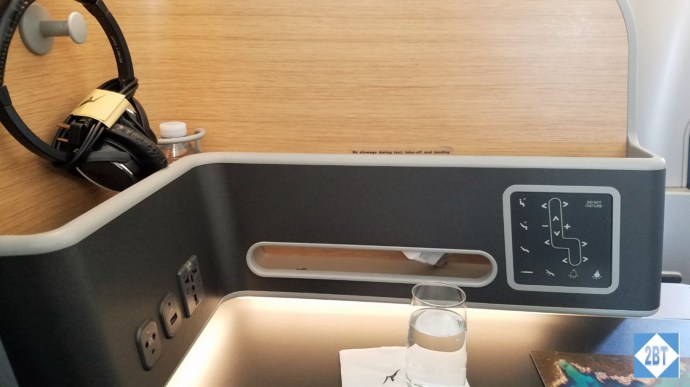 My large armrest was on my left (aisle) side and had an enclosed compartment running around the privacy partition. In the corner was an area specifically for the water bottle. A peg for the headphones was just above the compartment. The headphone jack, USB port and electrical outlet were part of the exterior of this section. On the side was the seat controls.