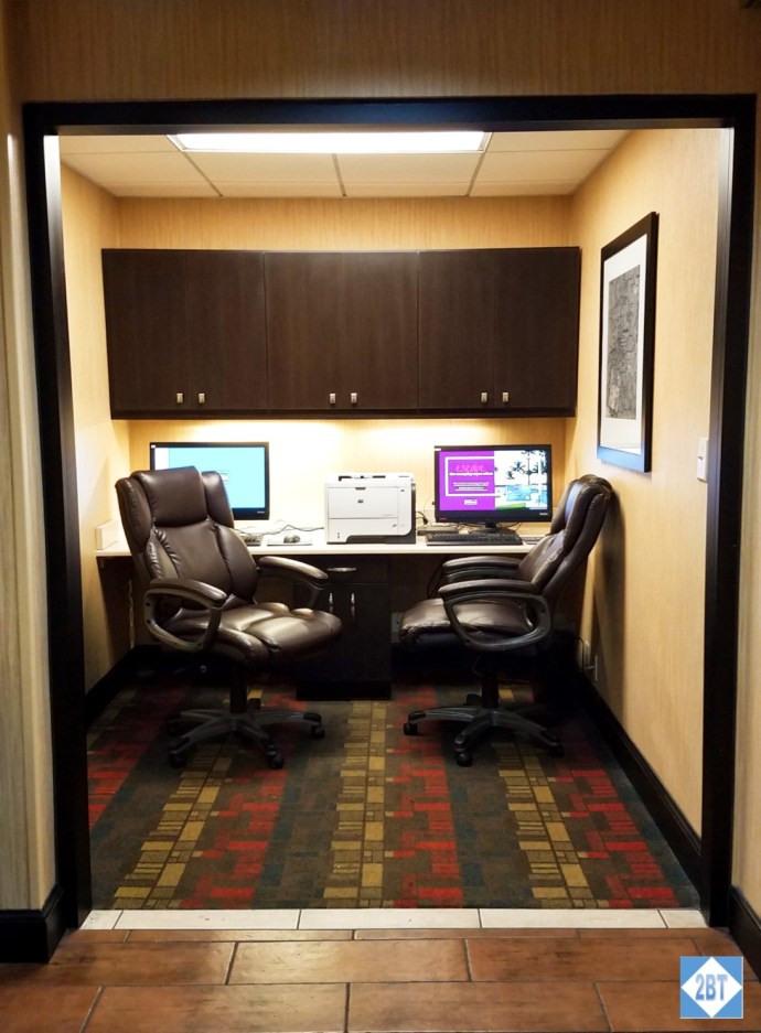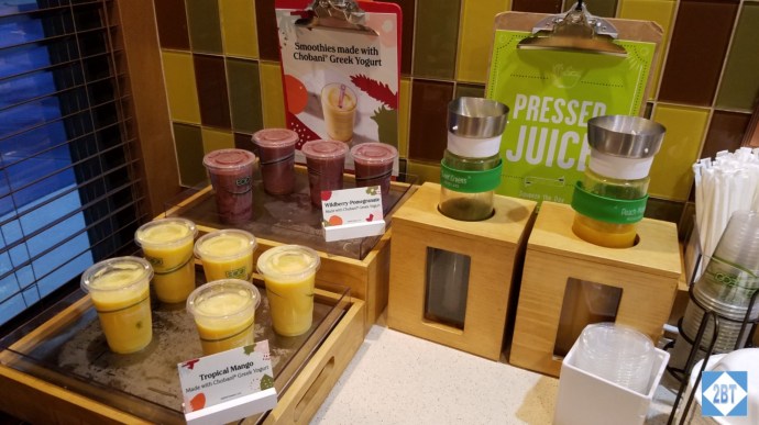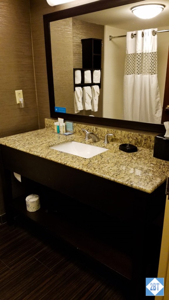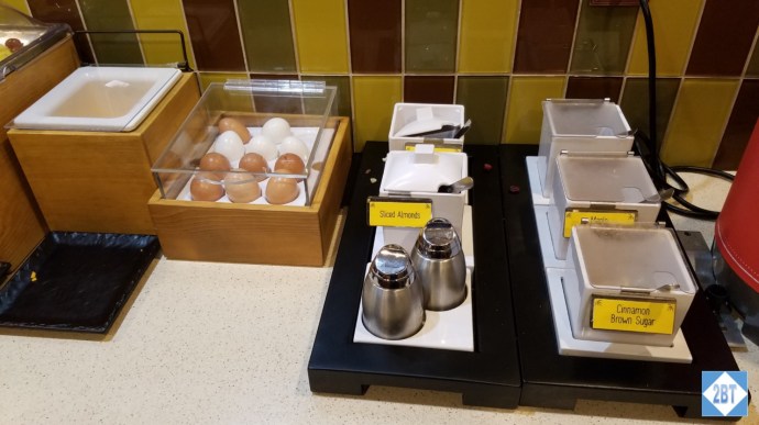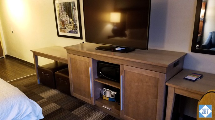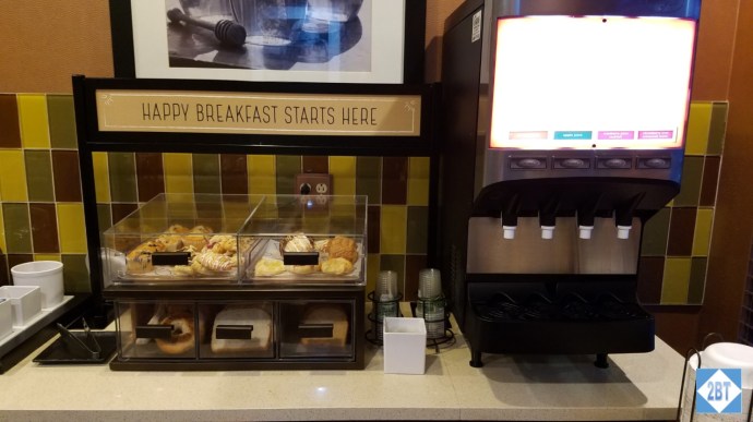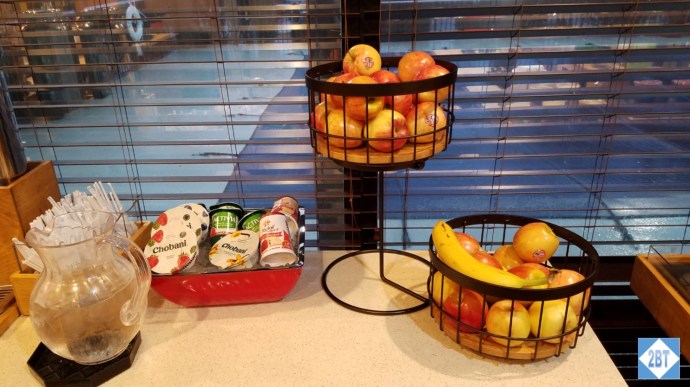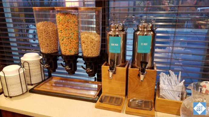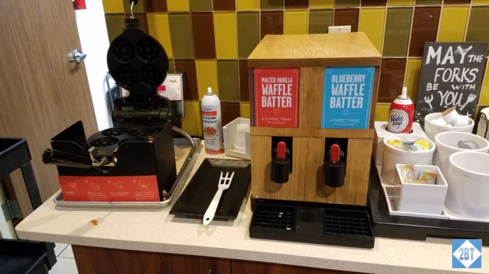 Breakfast is complimentary at Hampton Inns and is served from 6 to 10 AM. While it’s not a large spread, there was a decent choice. There are hot selections that vary a little each day. In the photo below tortillas are shown but on other days there were good ol’ Southern biscuits. Eggs, potatos and bacon were in the hot tray on this particular day. Oatmeal was a staple too as was French toast. There were a couple types of pressed juice, smoothies, yogurt and fresh fruit. There were three different types of cereal with your choice of skim or 2% milk. Several types of juices are available in the machine. Pastries and toast are on offer as well. And, like any good breakfast at a limited service property, there was a waffle machine.