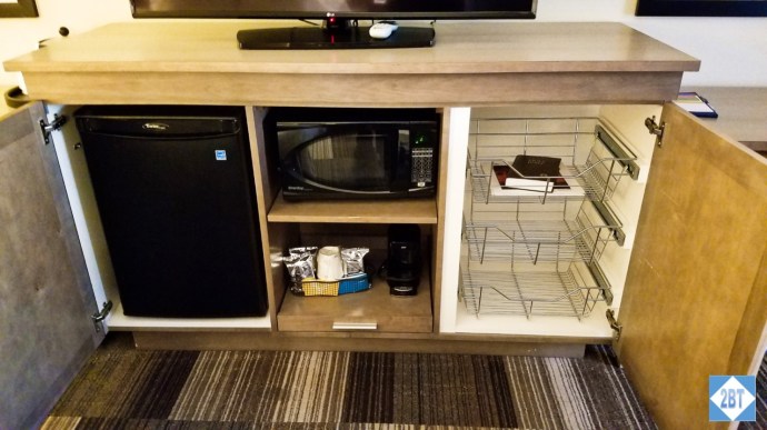 Inside the cabinet was the empty mini-fridge and some slide-out drawers for storage. The center section is not behind doors and contained a microwave and the coffee and tea supplies.
