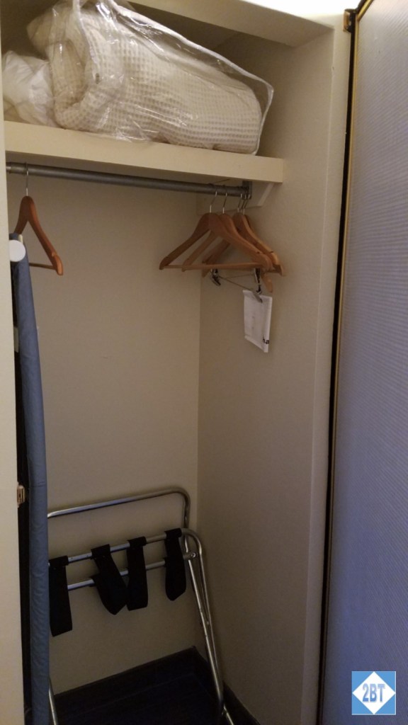 The closet was behind a full-length mirror and had a number of coat hangers, a luggage rack, the iron and ironing board, an additional blanket and the foam pillow.