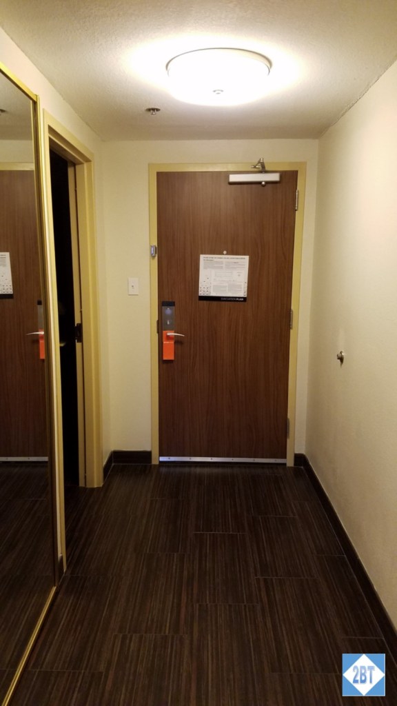 From the front desk it’s a short walk down this hall to the elevators, which are the first left turn here. There’s another outside door in this lobby. It leads both to the pool and to more parking.