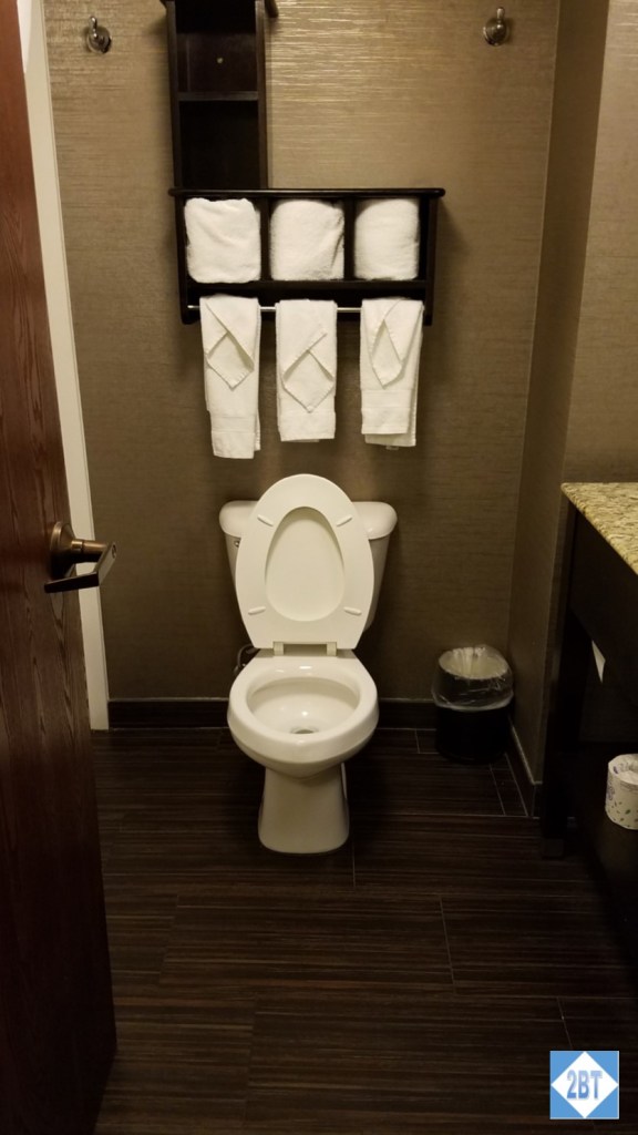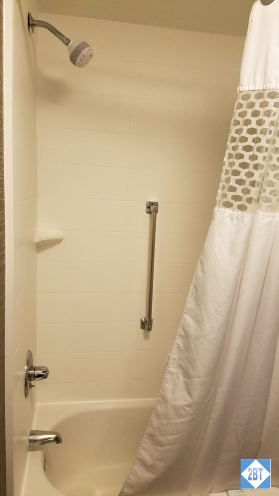 On the left was a shower/tub combo. The showerhead was by Water Pik and could be adjusted to provide a number of different spray patterns, which was nice. What wasn’t as nice was that the head itself couldn’t be adjusted much at all. In one of the bathrooms I kept hitting my elbow on the grab bar due to where I had to stand to be under the spray. It would be nice if that could be changed as well.