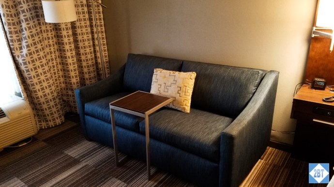 Next to the bed was a small sofa with a little table that could be used for dining or as a desk.
