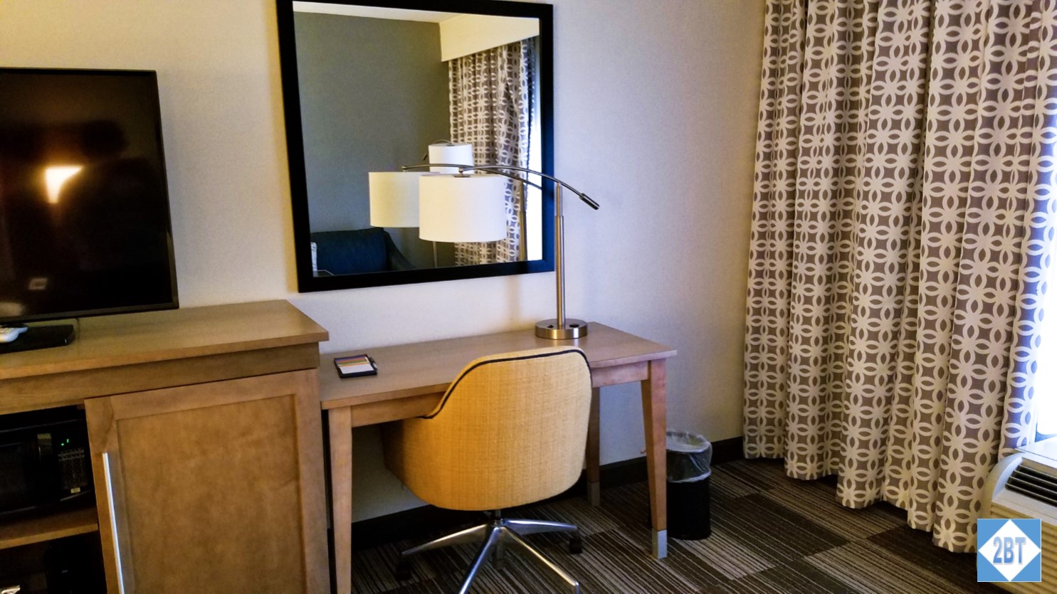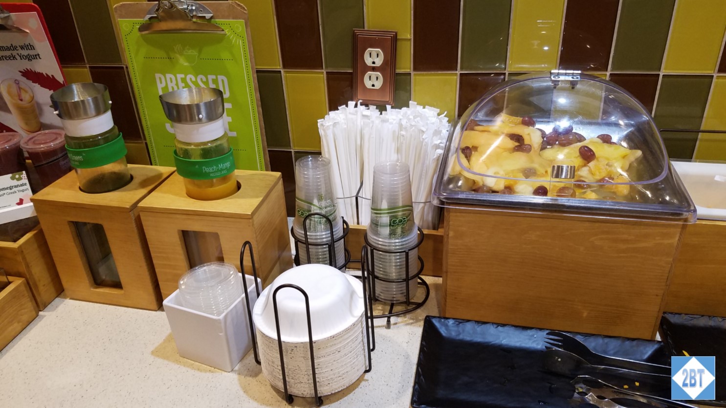 Breakfast is complimentary at Hampton Inns and is served from 6 to 10 AM. While it’s not a large spread, there was a decent choice. There are hot selections that vary a little each day. In the photo below tortillas are shown but on other days there were good ol’ Southern biscuits. Eggs, potatos and bacon were in the hot tray on this particular day. Oatmeal was a staple too as was French toast. There were a couple types of pressed juice, smoothies, yogurt and fresh fruit. There were three different types of cereal with your choice of skim or 2% milk. Several types of juices are available in the machine. Pastries and toast are on offer as well. And, like any good breakfast at a limited service property, there was a waffle machine.