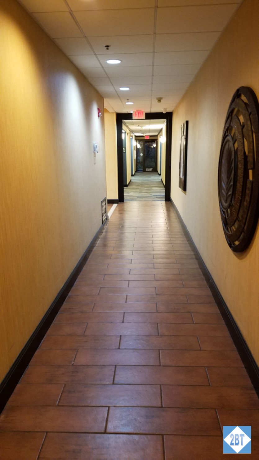 From the front desk it’s a short walk down this hall to the elevators, which are the first left turn here. There’s another outside door in this lobby. It leads both to the pool and to more parking.