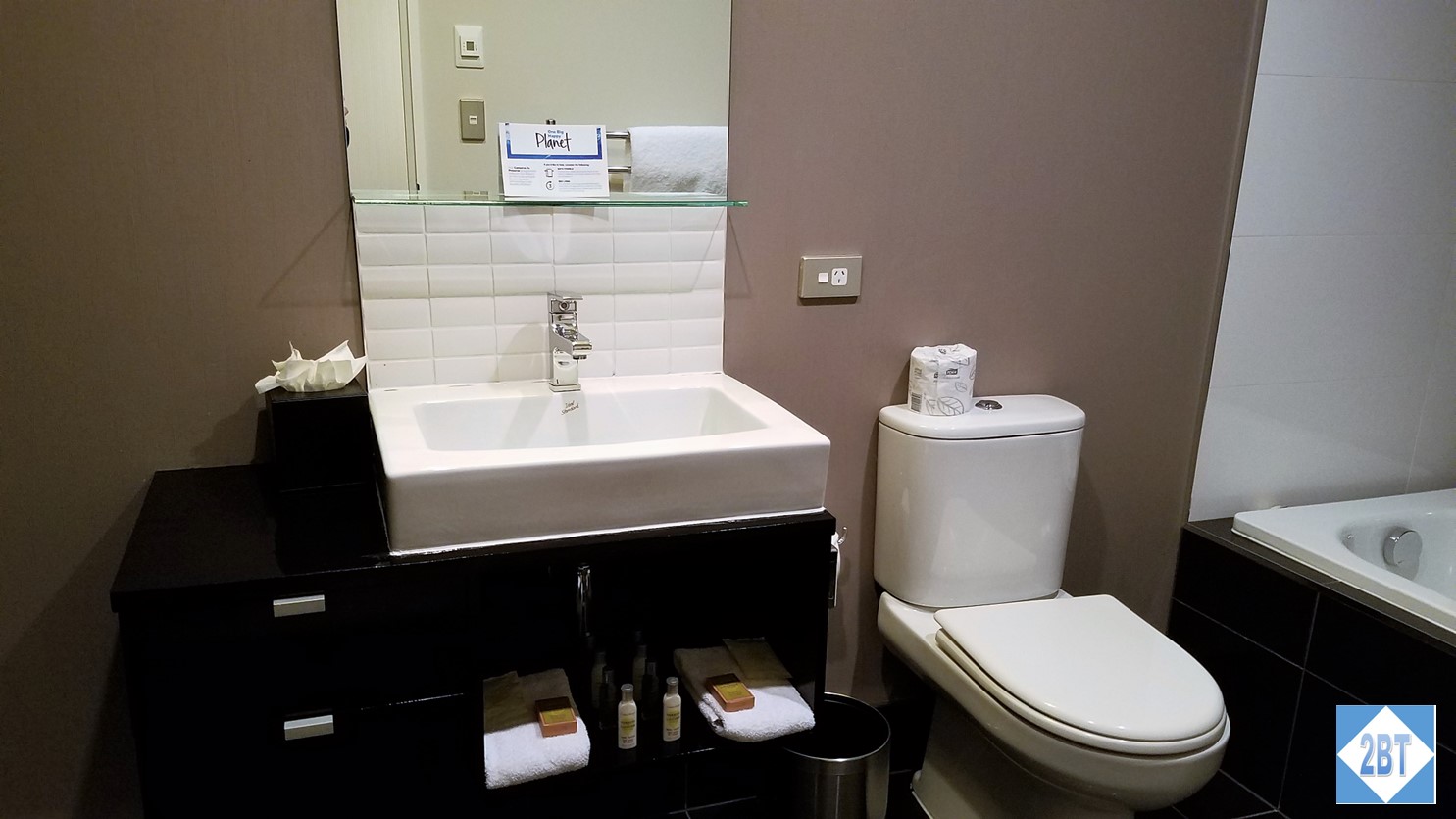 The hall bath wasn’t very wide but was fairly deep. The shower was quite large and shaped a little oddly as it ran along the back wall, which was against the hotel hallway. I’d love to see a little step in the back corner for ladies to use when shaving their legs. It would also be great if there was another shelf in reaching distance for storage of razors and shave cream.