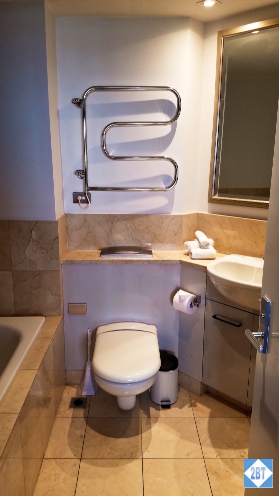 The hotel seems to be more apartment-style lodging than a “regular” hotel. We were given our card keys but were warned that if we lost one it was an $80 charge to replace it. I’ve never run into that before! The lobby is all marble (whether real or fake, I don’t know) with a carpet runner down the center. Staff members were friendly and recommended the Italian restaurant that’s on one of the lower floors of the building but is not affiliated with the hotel.