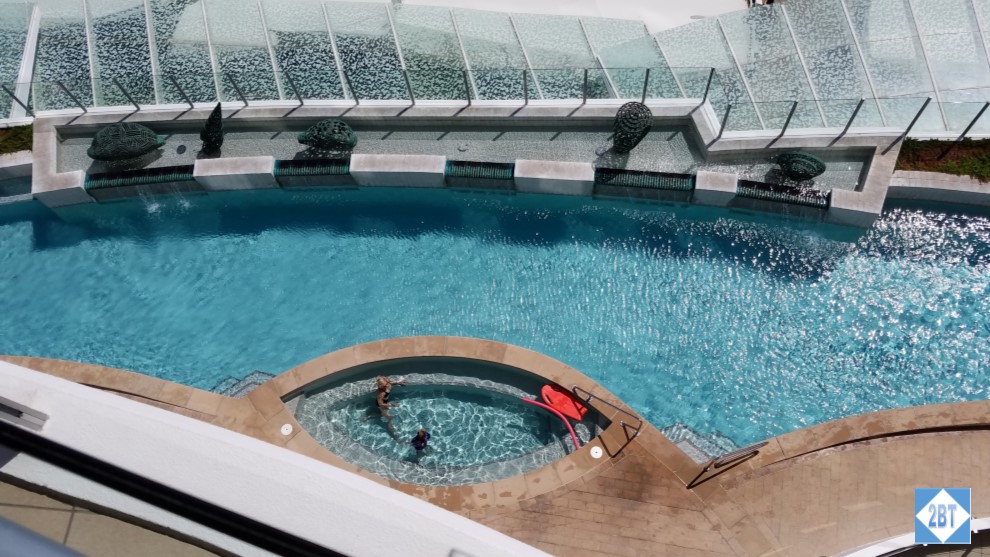 The hot tub is a walled-off section inside the pool and my friends did report some of the tiles were coming loose.