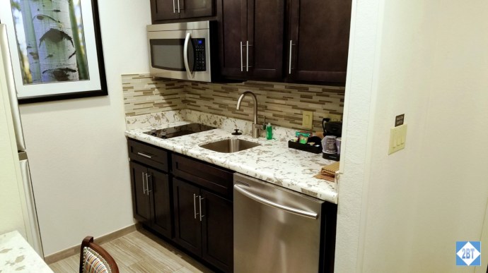 The kitchen was just inside the door on the right. It features a microwave, two-burner stovetop, a dishwasher and a full-sized refrigerator/freezer. It was clear more thought had been given into the design of this compared to another Homewood Suite where I’ve stayed and found that I couldn’t open the dishwasher fully because the kitchen was so narrow its door would hit the refrigerator. In this current unit the dishwasher was at the opposite end of the counter from the fridge and the galley space was wider so no danger of that here. A coffee maker is provided as a pots and pans if you want to do some cooking here.