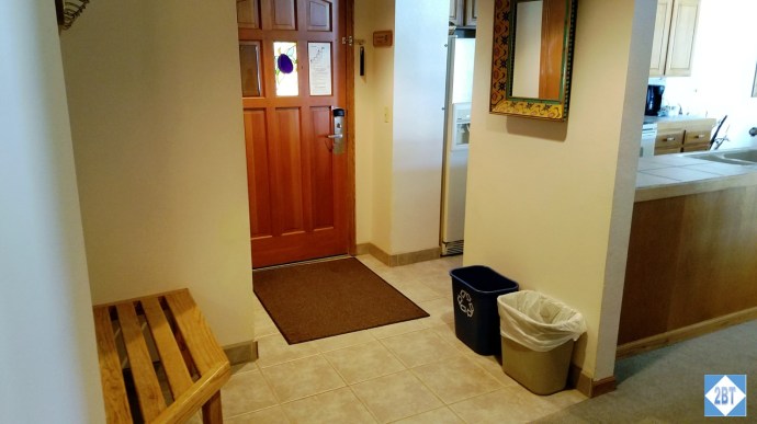 Our unit’s front door opened into a small entry hall with a bench and hooks that were handy for hanging our ski jackets as well as a closet.