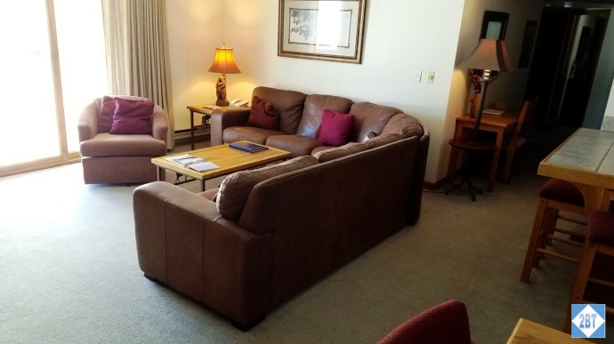 Most of our condos were 2 BR/2 BA units. We did have one 3 BR/2 BA unit and 3 BR/3 BA units are available as are 1 BR units. Ours was a 2 BR unit in the Plaza Tower. While the lobby and elevators are indoors, once you arrive at your floor you exit the elevator lobby to the outside to reach your condo. The condos in the Plaza Tower each have a locker for your skis located just outside your unit’s front door. The locker key should be hanging just inside your unit. The Creekside Tower has a ski locker room located on the ground floor on the way to the slopes. This is nice since it means you don’t have to haul your skis all the way up to your condo each day.