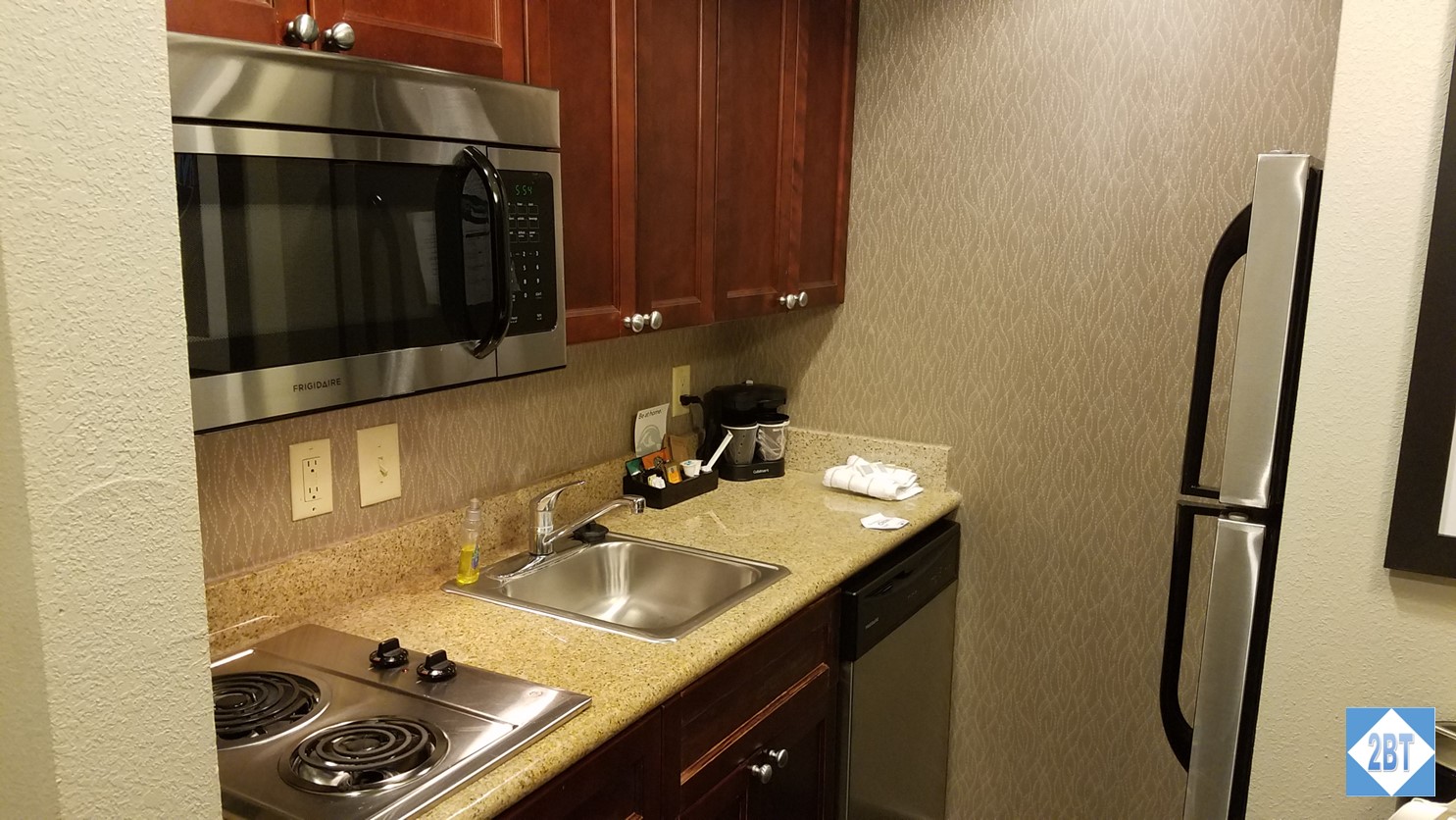 The kitchen design had the counter on the outer (hall) wall of unit with the fridge against the far wall but facing the counter. This caused an issue when trying to open the dishwasher. The kitchen is so narrow that the dishwasher door cannot be full laid flat which means you can’t really put anything in the back of the lower rack unless you have long arms or are a contortionist. This was never an issue for me as I don’t cook and could easily just use the top rack and the front of the lower rack. It was good to see in newer Homewood Suites (like the one in Steamboat) that the dishwasher was placed at the other end of the counter so there was no interference with its door.