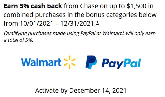 Chase Freedom’s Q4 categories are Walmart and PayPal.  Note that if you use PayPal at Walmart you’ll still only receive 5x points – no double-dipping!