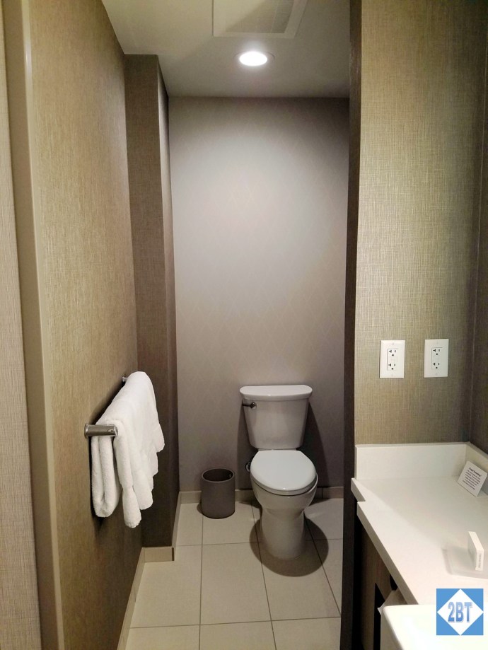 The shower stall was immediately to the right and the sink and counter space, which was quite generous, stretched along the back wall. Kudos for having a tall sink and then the counter slightly lower and narrow. It made navigating the room easier. I also liked the light embedded in the mirror. Along with the narrow counter it made it easier for me, a very near-sighted person, to get up close to the mirror and still have plenty of light.