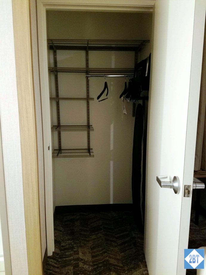 The closet was on the back wall by the window and was surprisingly deep. If you were to stay here for several days there’s plenty of room to stow your suitcase inside and also several small shelves for storage along with a rack to hang clothing.