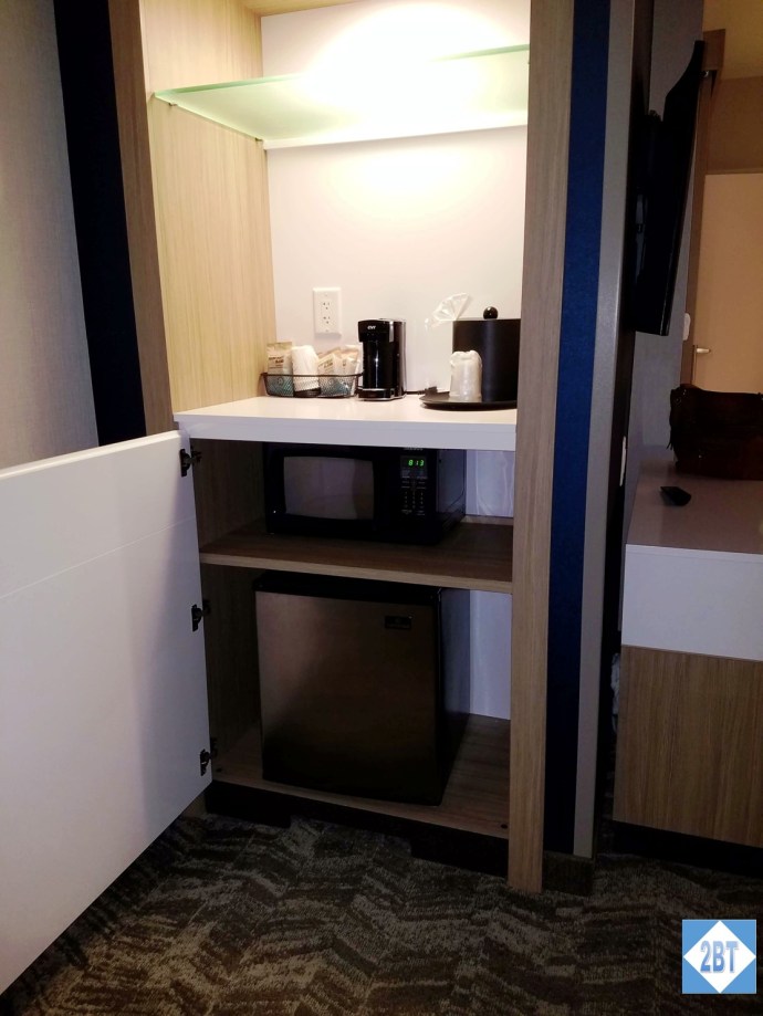 Directly across from the front door was the coffee station atop a cabinet with the mini-fridge and the microwave.