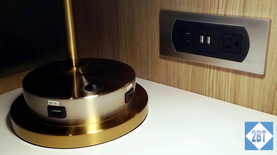 The king-sized bed was quite comfortable and had several outlets on the night stand too. I liked the different lighting options: a standard downward-facing light, an upward-facing light for indirect lighting and a reading lamp on a moveable arm.