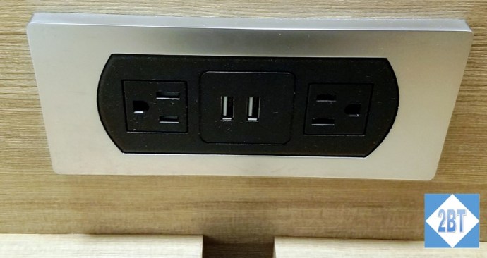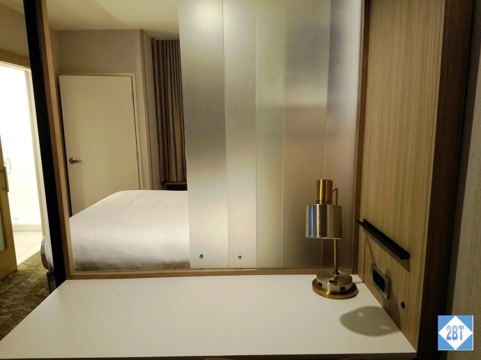 The desk had a set of sliding frosted glass panels to separate it from the bedroom. My one complaint about this is that because it was not a single sheet of glass, it tended to rattle a bit as I walked around the room or if I bumped the desk. There was a desk lamp as well as overhead lighting for the unit and some easily-accessible outlets.