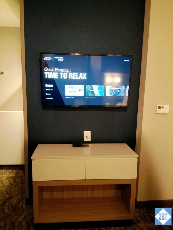 The TV, which could be angled toward either the sofa or the bed, was around the corner from the coffee station and I was greeted with a personalized message on the screen. I turned it off for the duration of my stay. Below it were a couple of drawers and a storage area that I used for shoes.
