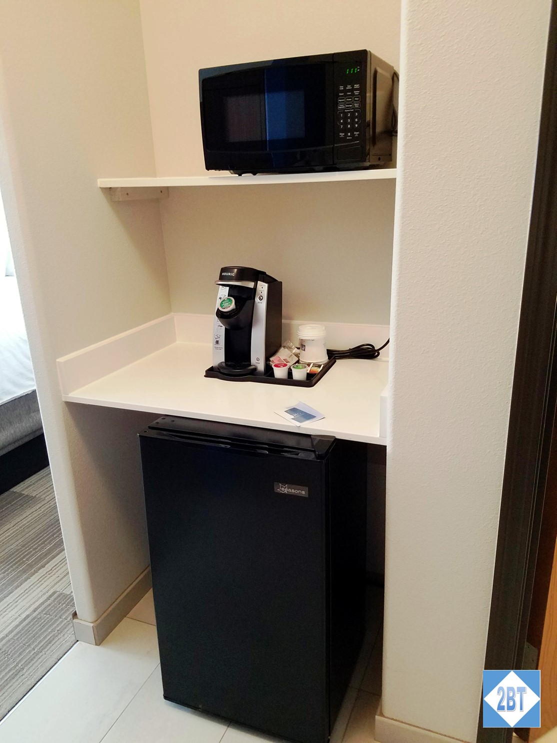 Just beside the bathroom was an area with a microwave, a Keurig and a mini-fridge (empty).