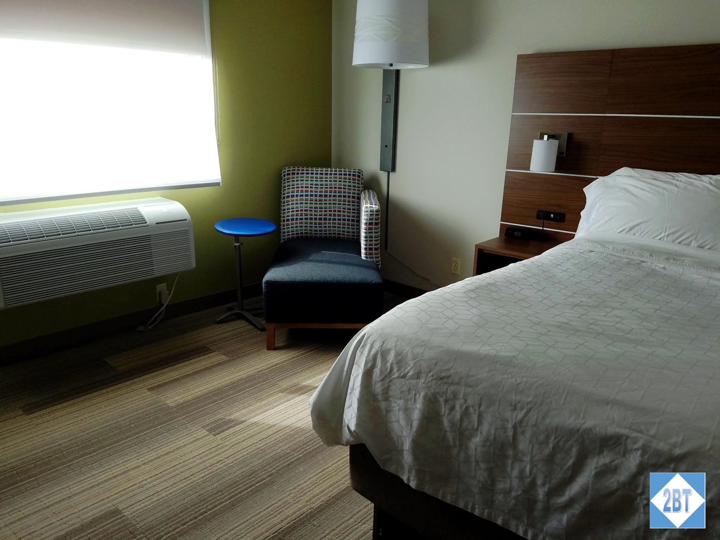 In the corner beside the bed was a chaise with a side table. I used this to eat a fast food lunch and it was adequate though not ideal. While the room has an under-the-window HVAC unit, at least it has an actual thermostat where you can set a temperature and put it on “auto” as well as selecting heat vs. cold. I hate it at some hotels when you turn the thermostat down a few degrees in the winter and the A/C automatically comes on rather than just letting the room cool down naturally.
