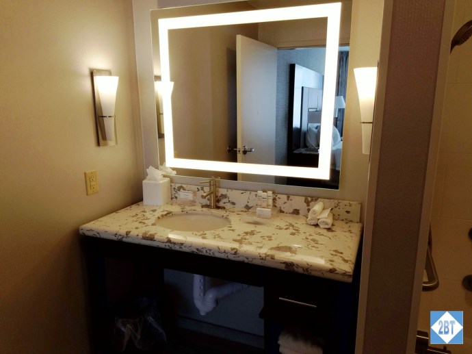 The bathroom’s entrance was beside the closet and this is where the accessible features were most notable. The vanity was quite tall but again had space under the sink for a wheelchair. I continue to love the light within the mirror. For those of us who are near-sighted it’s very helpful.