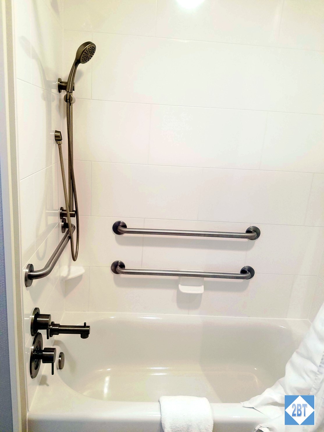 The tub itself had three grab bars and a hand-held shower nozzle. There was an extra control which directed the spray between the hand-held nozzle and the wall-mounted one. It took me a moment or two to figure out how to get the spray where I needed it but it was fairly intuitive.