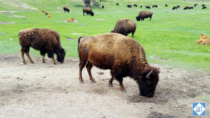 The drive from the Crazy Horse Memorial to Custer State Park is only about 30-40 minutes on 2-4 lane highways. Before entering the park we asked the ranger at the gate about where the bison herds had been spotted and she actually pointed us to a spot down the road outside the park. Her info proved reliable as there was a small herd there including several babies. Calving season occurs around March-April so these 1-2-month-old calves were just adorable.