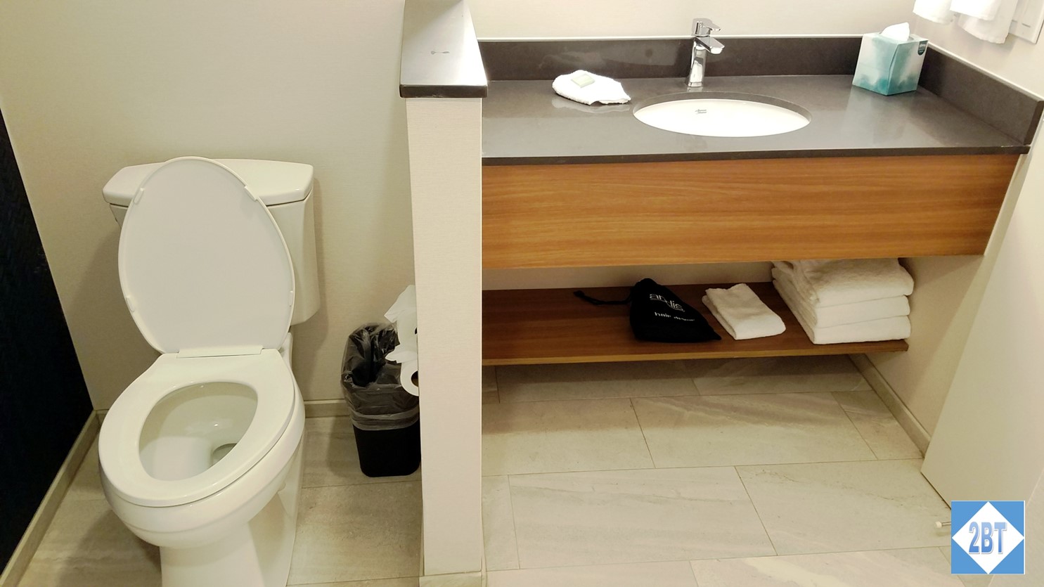 The bathroom sink and toilet were on the right-hand wall and the shower/tub was on the left side. There was ample counter space on either side of the sink, which was nice, and the shower was the best one of this trip. It had good water pressure and the shower spray could be concentrated for a very firm-feeling spray. Like at the TownePlace Suites the night before, toiletries were wall-mounted containers of Alice + Co. I was apparently the first one to use the hair dryer as it still had a couple of twist-ties on the cord. My one minor gripe was that the bathroom door would not stay open by itself.