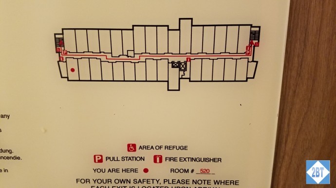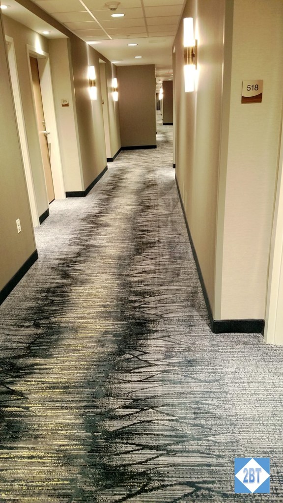 Once again the front desk team member was quite friendly and cheerful despite the late hour. I was assigned a room on the fifth (top) floor. This hotel’s design is a little unusual in that the entrance is at the narrower end of the hotel’s footprint with the central hall extending straight back from there. That left more space for guest rooms, meeting rooms and other amenities, I guess. The elevator is in the center of the building and when I exited on the fifth floor I assumed my room was going to be close to the elevator. I was assigned room 520 and the sign said rooms 501-520 were to the left and 521-(whatever) were on the right. But no, room 501 was right in the middle of the building and my room was at the very end. That’s a very unusual way to number the rooms.