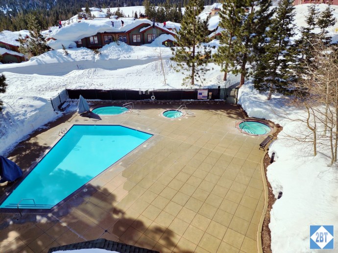 The back exit of the lobby opens on to a large patio where the heated pool and three hot tubs are located. These saw extensive use at the end of the ski day.