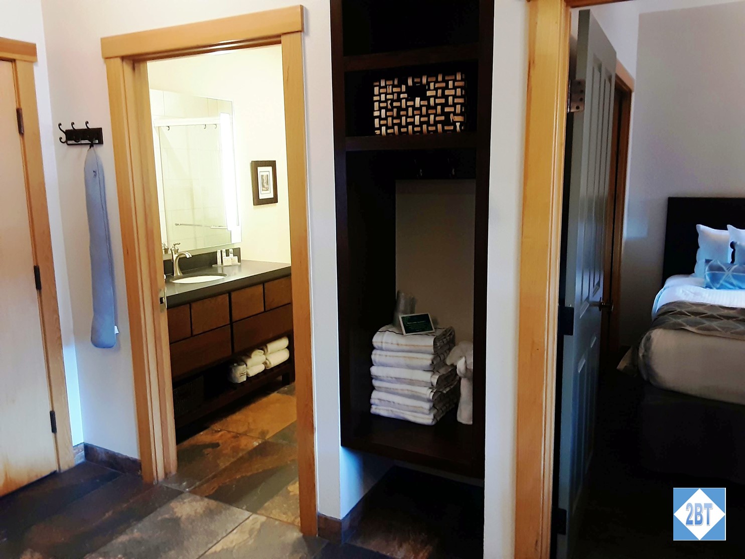 The Juniper Springs Lodge is at the base of the Eagle Lodge and Eagle lift on the left side of the trail map. So it’s super-handy for getting to the slopes. But if you don’t have a vehicle, you’re at the mercy of the town shuttles. Both the Green line and the Yellow line stop by every 20 minutes during the day, but after 5:30 there’s only the night trolley which is every 30 minutes, is on only one route and only runs in one direction so you may have to ride the long way ’round to get back. There is no restaurant in the lodge and once the Eagle Lodge closes at the end of the ski day, there’s no restaurant within easy walking distance.