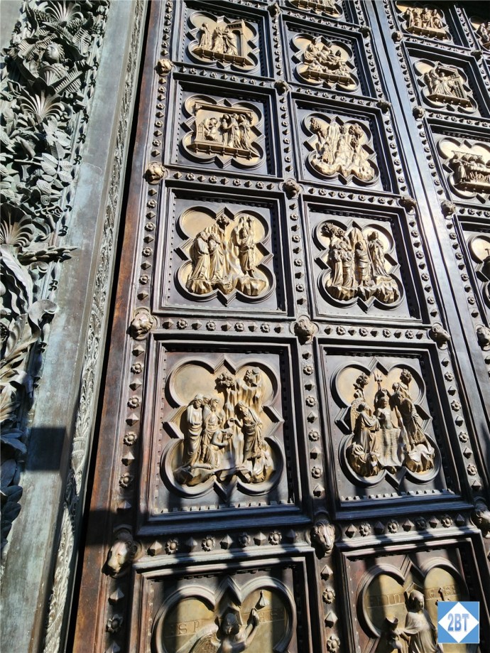 The East doors are known as the Gates of Paradise (though these are copies) which depict scenes of the life of Christ. Designer Lorenzo Ghiberti was only 21 years old when he won the competition in 1401 to create the doors and it took him another 21 years to create all the panels.