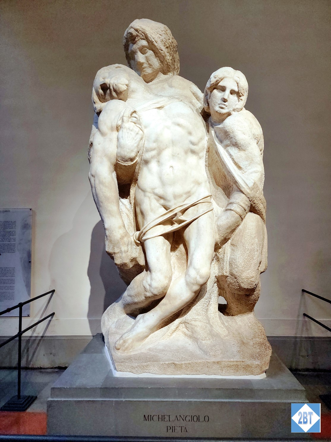 While not as famous as his Pieta in the Vatican, the Accademia has another one called the Palestrina Pieta from Michelangelo. Dating from the mid-1550s there is apparently some controversy as to whether or not it was finished by someone else. Regardless it’s in the style of the master with sharp details of Christ and rougher figures of Mary and one of the apostles. But note how large the right arm and hand are in comparison to the rest of the body.