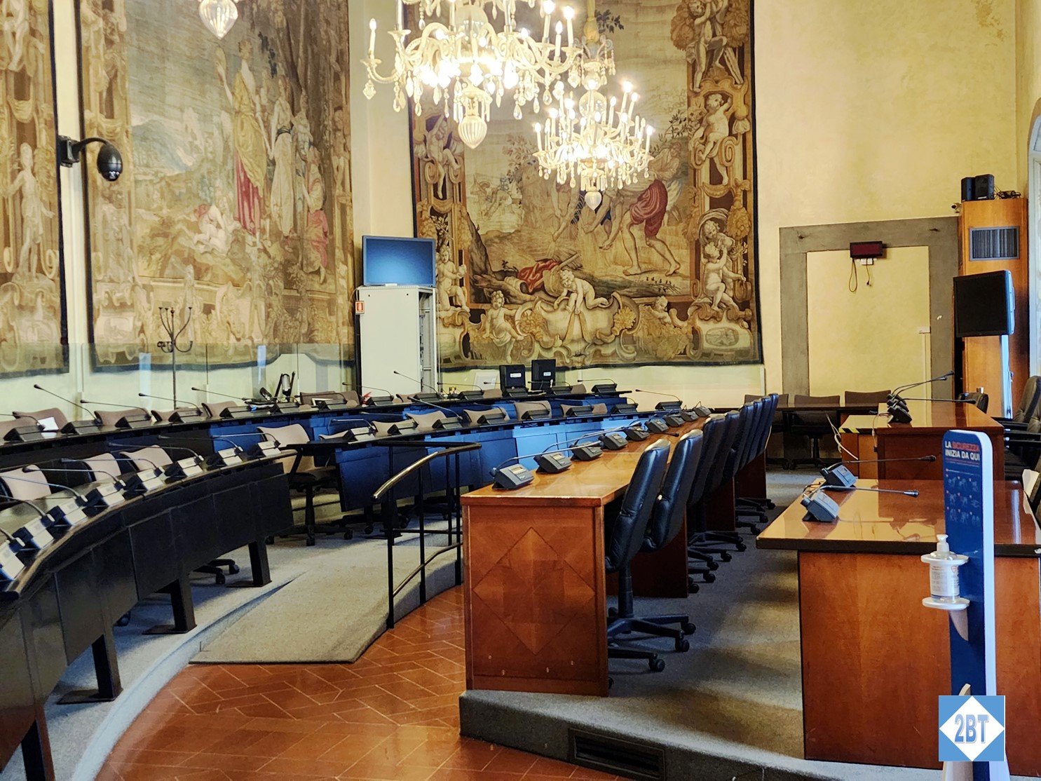 The next three rooms are the Salon of Charles VIII, named for the French king who met with the Senator of the Republic in 1494. This great hall has magnificent Baroque tapestries though it is set up for a modern presentation.