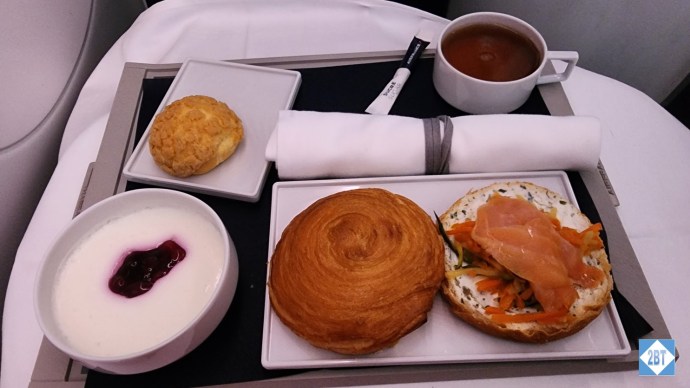 Our snack before landing included smoked salmon, red berry coulis on plain yogurt and a vanilla cream puff pastry.
