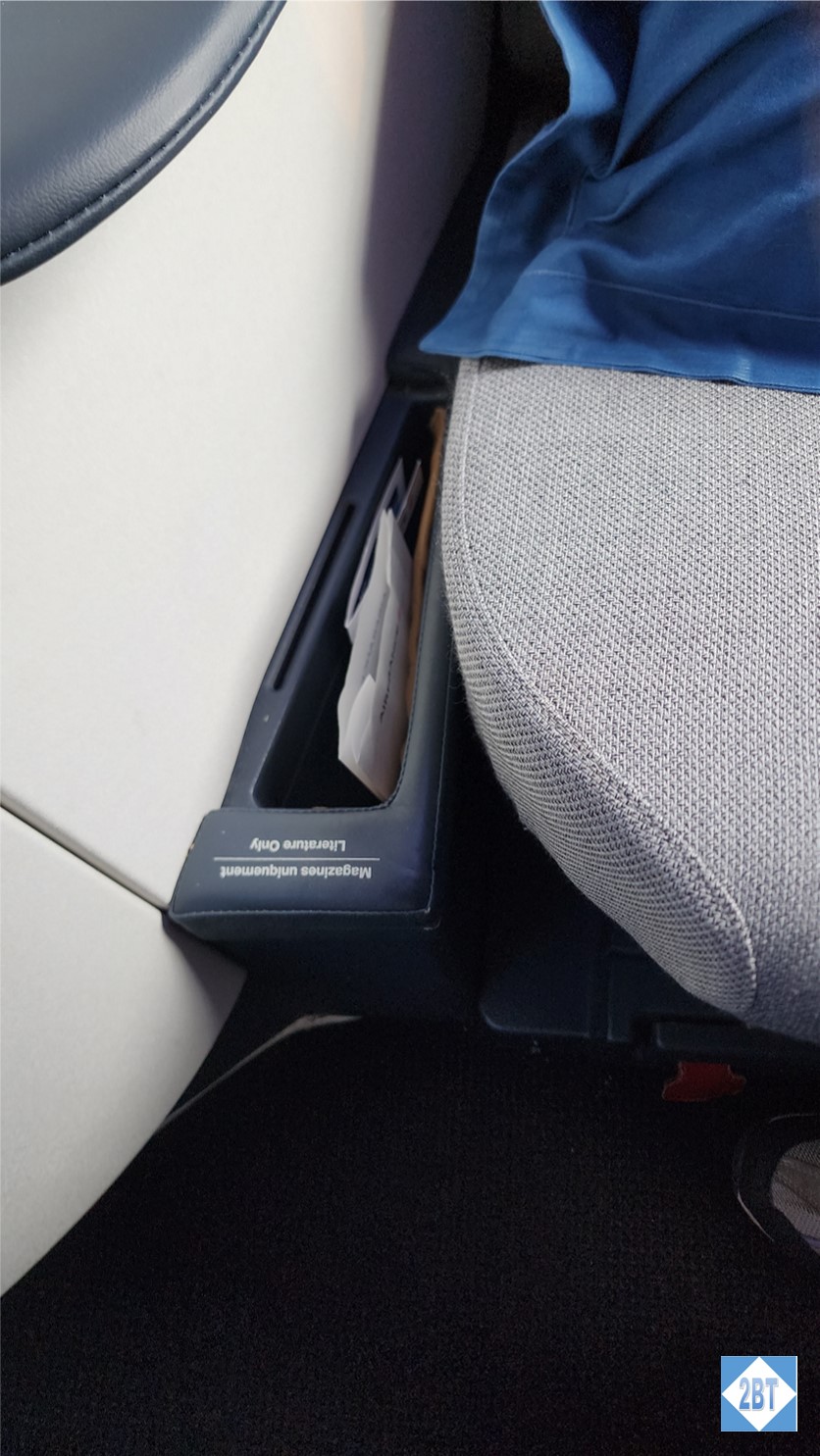 Next to the headrest was a compartment with the headphones, a water bottle and a mirror on the door. Beside that was the IFE and seat controller and below that was a outlet that supported both US and European electrical outlets and a USB-A port.