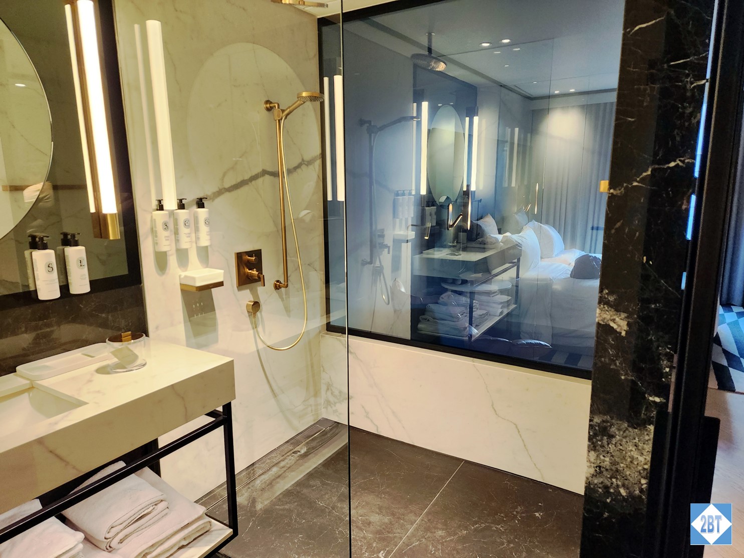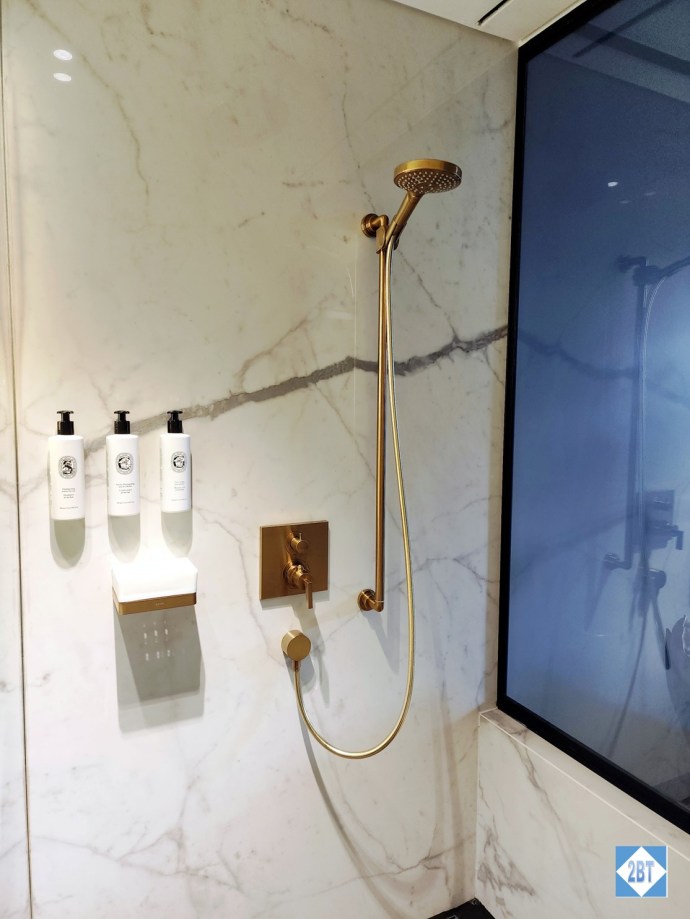 The glass shower wall that separates the shower from the bed area is one that can be clear or opaque with the touch of a switch. I’m still not sure who thinks this is a good idea but we were just relieved to note it can be made opaque. One thing I did like was that a toothbrush holder was provided. This is something I wish more hotels would provide so I don’t have to use a drinking glass.