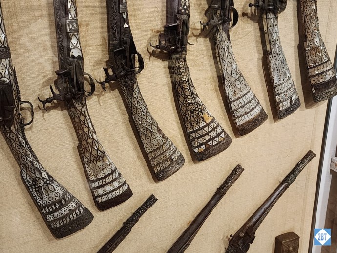 There were several cases featuring guns ornately decorated with mother-of-pearl.
