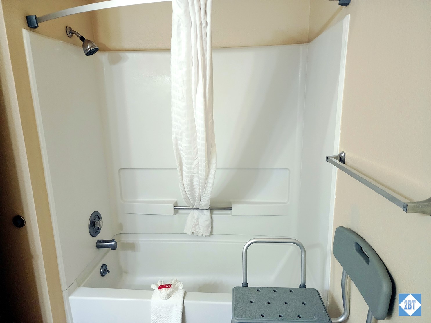 The bathroom was very large, I assume because this was an ADA room. It had a shower chair that could straddle the side of the tub though I didn’t need to use it. I liked that the shower curtain rod was curved as it made the tub area feel bigger. The shower head itself was in desperate need of cleaning but the water pressure was good and hot water was plentiful.