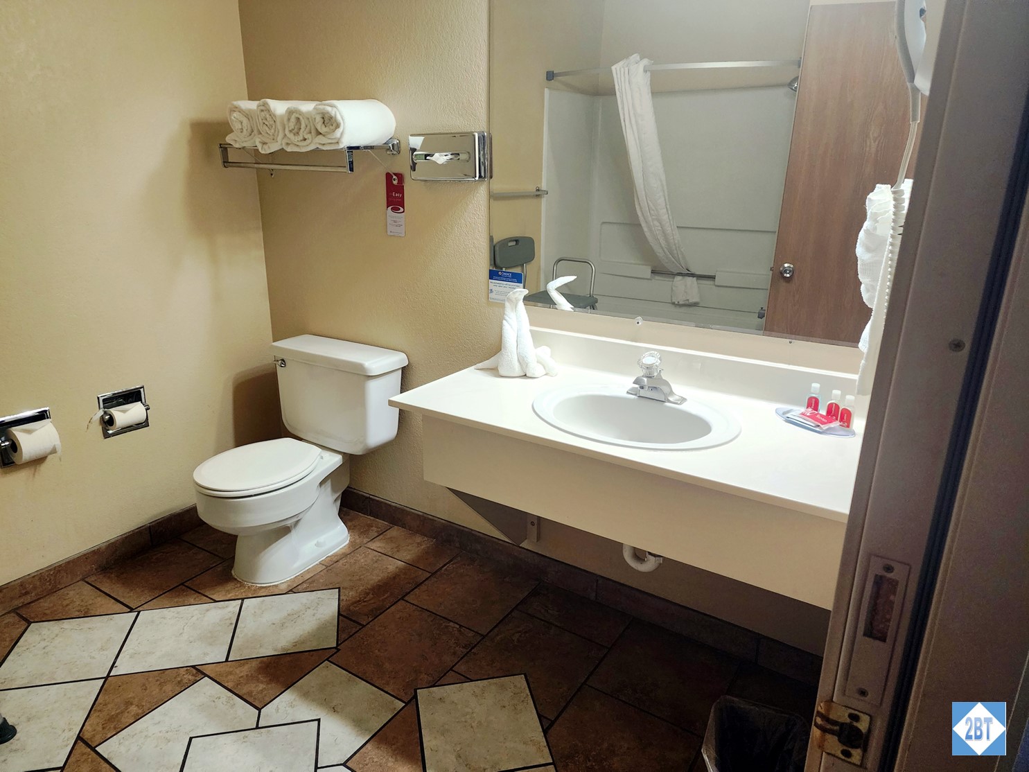 As my family wanted to get back to Denver in time for the Super Bowl, our Sunday ski day was much shorter than normal and they’d deposited me at the EconoLodge around noon, well before the posted check-in time. In fact, when I handed the desk clerk my ID and credit card she seemed to think I was checking out, not in! Even though I was early they managed to find a room for me. I’d requested a king room on the ground floor and one was available, although it was an accessible room and so had features I didn’t need. But that was fine with me.