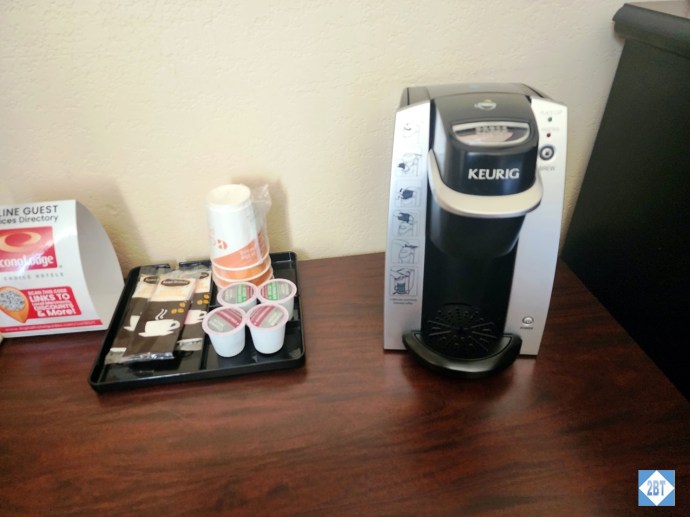 The Keurig machine was on top of the desk too. It only had coffee pods but I didn’t check to see if tea or hot chocolate pods were also available.